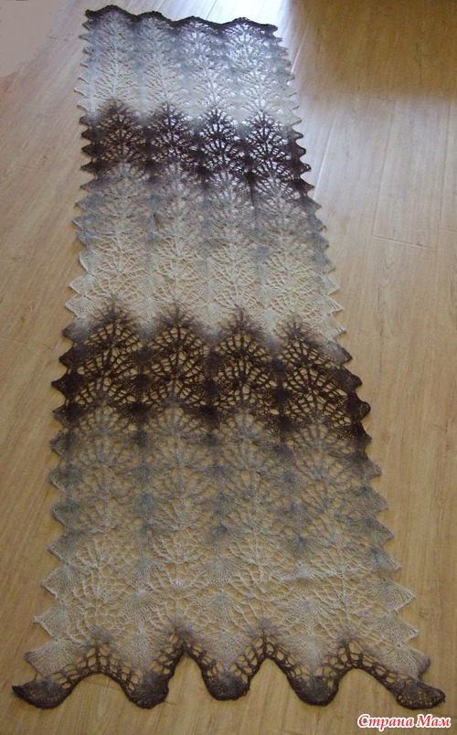 Размер готового изделия 2,4 м на 1,1 м. спицы от 2,5 до 4,5.
