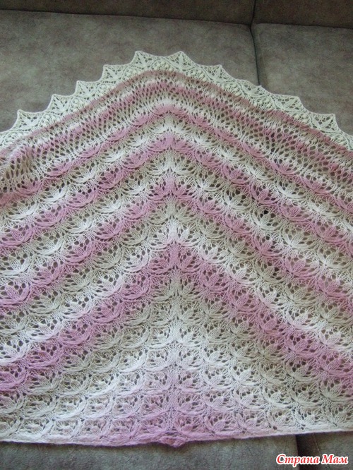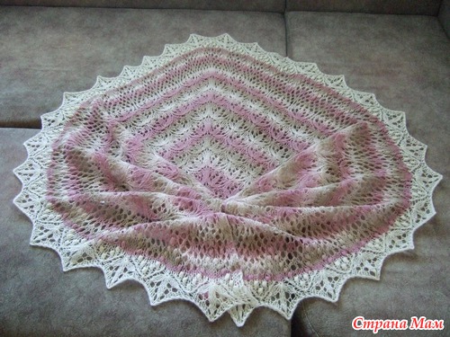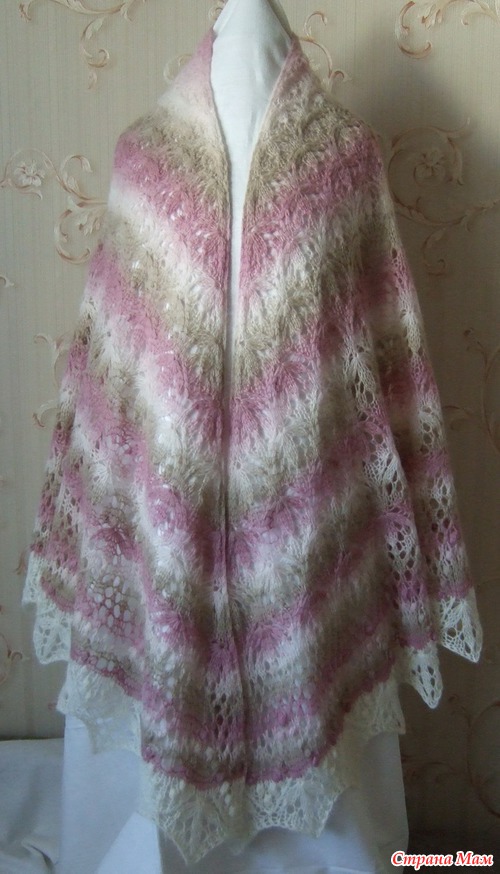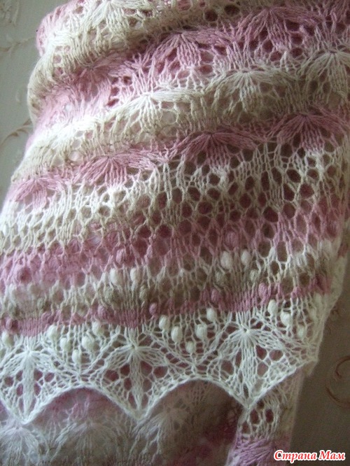 Шаль выполнена на схеме шали "Цветочное эхо". Вес пряжи - 248 г (было 2 мотка Пастилы и кайму довязывала белой ровницей).