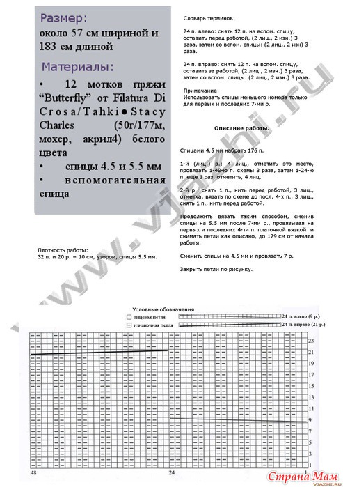 Плотность работы: 32 п. и 20 р. = 10 см, узором, спицы 5.5 мм.