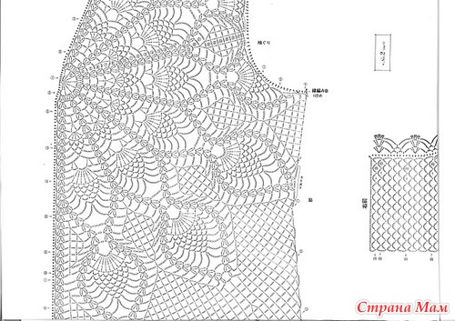 Далее по обе стороны вязать 3-ю часть: 2 (3) р. филейных ст. с/н = 1 ст. с/2н, 3 возд. п. = 13 (14) филейных рисунков.