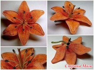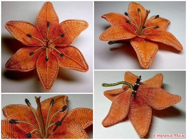 Такой красивый вязаный цветок тигровой лилии будет прекрасно смотреться в качестве броши, а так же подойдет для ободка или заколки.