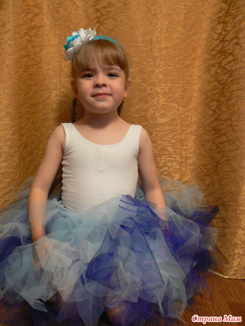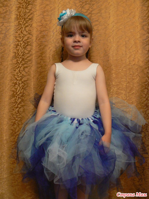 В итоге: 6 метров фатина (по 2 метра темно-синего, голубого и белого) были раскроены на полоски шириной 10 см и длиной 70 и завязаны на резинке (окружность талии - 5 см) шириной 3 см.