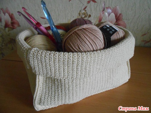 я вязала из жесткого хлопка. Случайно в магазине увидела на бобине - называется "Калаланка". Немецкий хлопок. Любой жесткий материал подойдет. В две и в три нити можно - как руки выдержат) из жесткого не очень легко вязать. Но чем жестче, тем лучше корзинка держит форму. Из полиэтилена еще хочу попробовать, но это уже совсем для хозяйственных нужд) Из пряжи - они вроде как элегантнее и интерьернее))