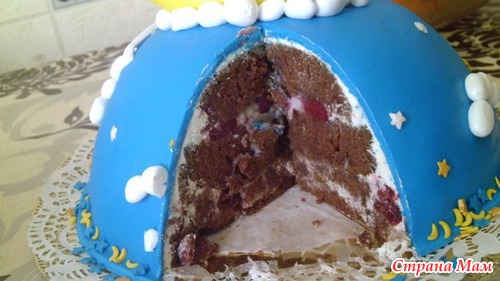 2. Фея на Луне. С этим целая история. Тортик заказывали те же, для кого клубнику делала. Сначала мамочка хотела Винкс, желательно 2-х, а еще лучше 5, и желательно вес около килограмма))), а то больше они не съедят, но у меня и опыта такого нет еще для этих феек и по килограмму как то я не делаю) так что я сразу отказалась. Ну в общем потом она все таки решилась- остановились с ней на Луне))) А когда я фотку готового торта вечером отправила, она меня прям ошарашила- сначала спросила почему месяц желтый, а потом сказала, что он вообще на банан похож(( В общем я расстроилась- жуть, потом правда, когда забирали сказала, что в живую лучше смотрится и ей ооочень понравился, но осадок-то остался. Вот собственно и "виновник" моего расстройства. Внутри шоколад на кипятке с вишней, крем заварной с маслом. Вес 2 кг