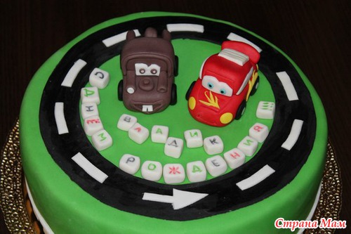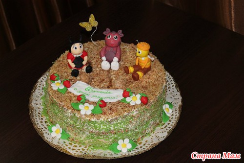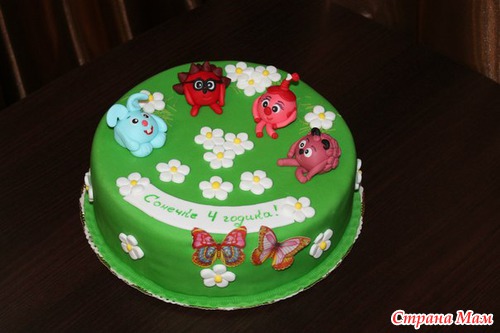 6. Лунтиков, смешариков и тачки я уже с закрытыми глазами леплю))) Состав уже не помню, а вес у всех около 2,5 кг. С Лунтиком просили именно без мастики, поэтому покрыт просто крошкой с грецкими орехами, а по бокам соломка