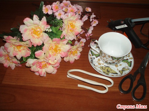 Приклеиваем цветочки, начиная со дна чашки. У меня это один большой цветок, маленькие приклеиваем ровно с двух сторон от провода, а затем в получившуюся пустоту между цветочков на провод...