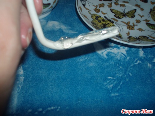 приклеиваем один конец, сначала к чашке, нанося большое количество горячего клея на провод. Девочки клея не жалейте иначе не будет держать!!!