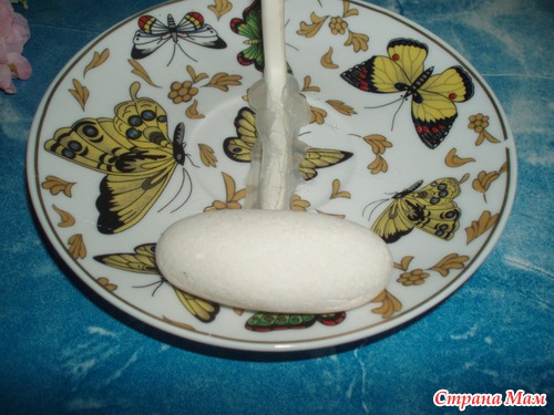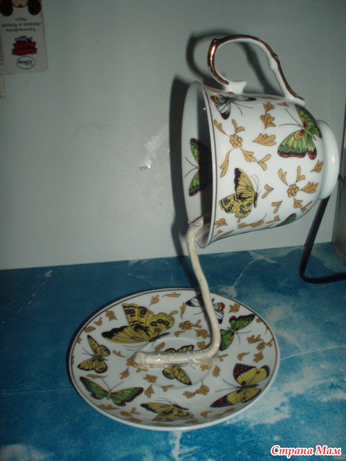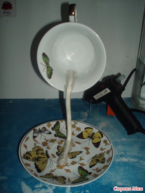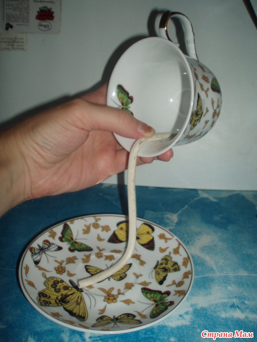 Немного наклоняем чашку вперёд, для того, чтобы придать композиции устойчивость. Можно смазать ещё раз горячим клеем в местах соединения провода и блюдца, особенно у сгиба провода - для придания жесткости. Наша заготовка готова!!!