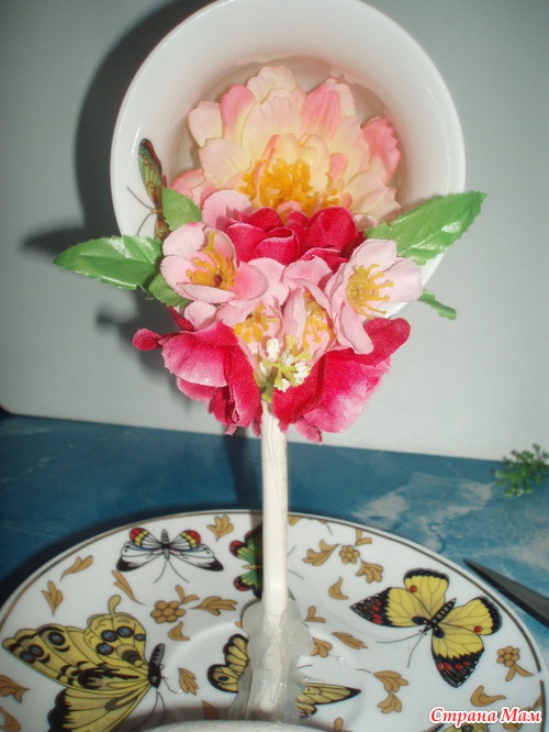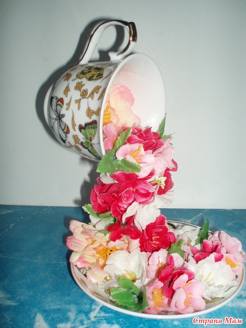Если ваша чашечка переворачивается, т. е. не держится, то можно на блюдце приклеить не большой груз(у меня на фото большой, т. к. не нашла маленький ) он все равно закроется цветами...