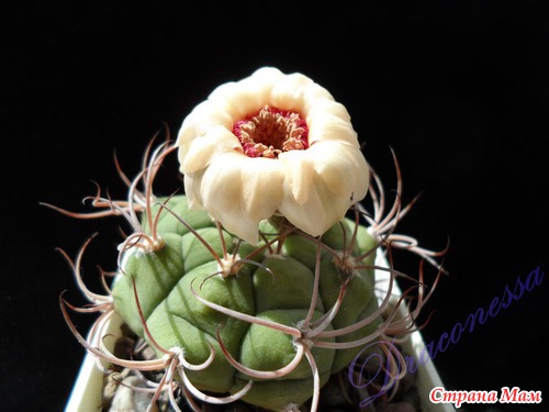 Ещё один из любимчиков - Gymnocalycium damsii. Этот кактус я купила в супермаркете. Обычно я так не поступаю, т. к. там в основном стоят перекормленные "огурцы" с залитыми загнивающими корнями и иногда даже с нежелательной живностью. Основную часть коллекции я вырастила из семян. Но, видимо, растения завезли совсем недавно, выглядела полка с кактусами довольно прилично и я схватила там парочку колючек. Муж попытался, было, возразить, что мы пришли за продуктами, а вовсе не... но я уже бежала на кассу с криком: "Надо спасать, пока не загубили!"