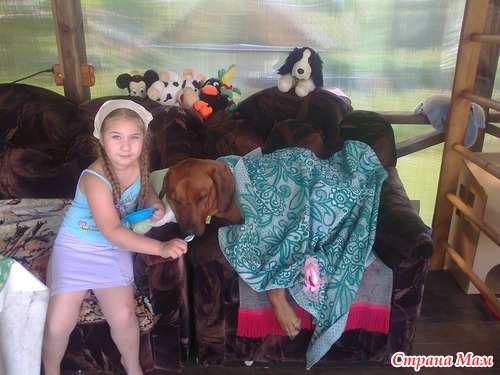 А то! Собакин у нас сегодня "больничный". Т.е. я так понимаю, что в больничку играют. Видимо дочь - сестра милосердия. Правда собак не совсем с таким милосердием согласен и все время порывается слинять.