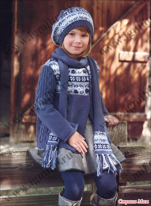 Вязаный комплект для девочки 4-9 лет. Двубортный жакет с жаккардовыми узорами и косами, берет и шарф. Спицы