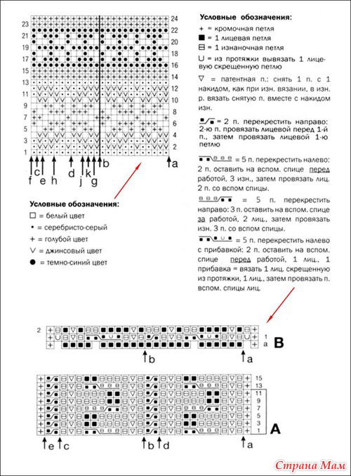 Плотность вязания: 24 п. и 32 р. рельефного узора = 10 х 10 см; 20 п. и 32 р. лиц. глади = 10 х 10 см; 22 п. и 28 р. жаккардового узора = 10 х 10 см. спицами №4.