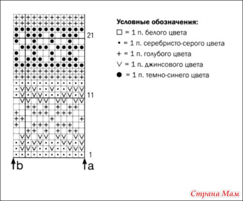 Набрать 31 п. пряжей джинсового цвета и спицами № 4 вязать, начиная с изн. р., 5 р. = 1,5 см лиц. гладью. Кром. п. вязать лиц. Затем вязать жаккардовую вставку: сначала р. 14-24, затем р. 1-13, при этом распределить п. след. образом: кром., 3 п. перед стрелкой b, 2 раппорта между стрелками a и b, закончить 2 п. после стрелки a, кром. Через 24 р. = 8,5 см жаккардовой вставки продолжить работу лиц. гладью пряжей джинсового цвета, при этом в 1-м р. с обеих сторон закрыть по 1 п. = 29 п. Через 120 см лиц. глади джинсового цвета прибавить с обеих сторон по 1 п. = 31 п. Затем вязать р. 1-24 жаккардовой вставки по схеме, распределив п., как в начале шарфа. После этого провязать 5 р. лиц. гладью пряжей джинсового цвета и закрыть все п.
