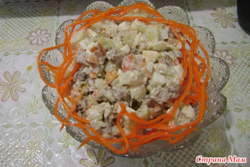 Я делаю салат, похожий на "балерину", только без грибов, лук маринованный в уксусе, вместо грибов- вареная тертая морковь, белки и желтки идут отдельными слоями, мои очень любят!!!