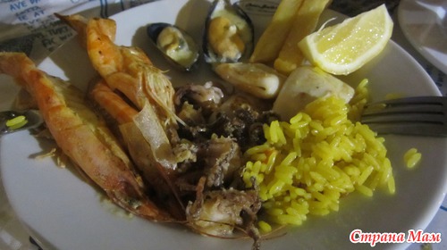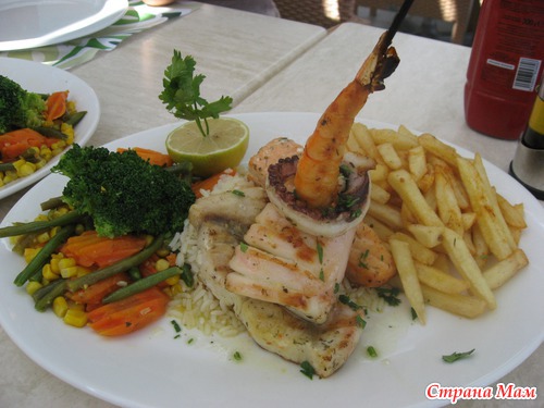 Это полноценное блюдо на одного: салат + горячее: Кольца кальмара на гриле с рисом овощами и фри. Нам на троих хватило наесться, а одну бы просто разорвало от такого количества