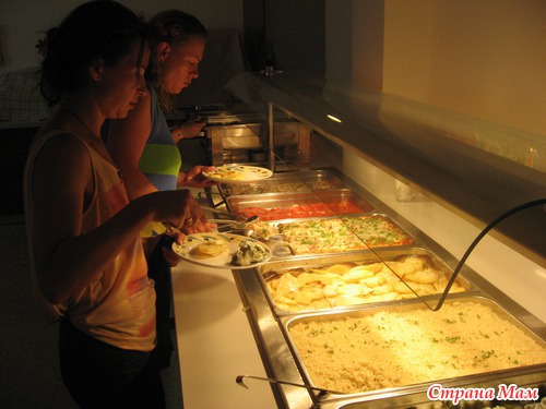 Стол с горячим и гарнирами. Всегда был рис, фри, овощи. Рыба обязательно, курица и мясо