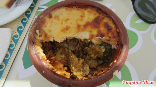 Кипрское блюдо Мусака: Баклажаны тушеные в горшочке с мясным фаршем, помидорами, под соусом бешамель