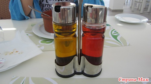 Во всех кафе, барах и ресторанах такие вот бутылочки: оливковое масло (без него там никуда) и винный уксус - очень вкусный