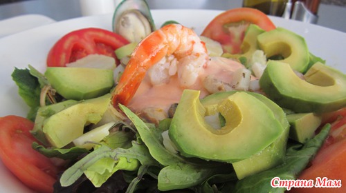 Салат с морепродуктами, но в другом исполнении. Меня эта раковина из лаваша покорила