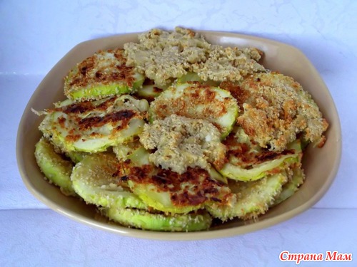 Последние кабачки я уже не смогла обвалять в сухарях, потому что сухари стали влажными. И вот эту сырно-сухарную смесь я просто накладывала на кольца. Поэтому на блюде видны блямбы этой запечённой смеси. Для себя я сделала вывод - пергамент надо смазать подсолнечным маслом, чтобы кабачки легко отставали.