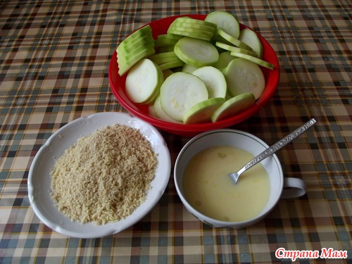 Итак, для приготовления этого блюда нам понадобятся очищенные от кожуры и порезанные кольцами кабачки. Колечки нарезать толщиной по пол-сантиметра. Посолить. В отдельной посуде взбить 3 яйца с тремя ложками молока, посолить. В тарелке перемешать панировочные сухари с натёртым сыром.
