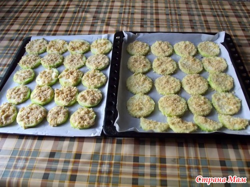 Противень застелить пергаментом для выпечки. Каждый кругляшок кабачка вначале обвалять в яйце потом в сухарях с сыром. Разложить на противень и поставить запекать в духовку. При температуре 180-200 град на 30 минут.