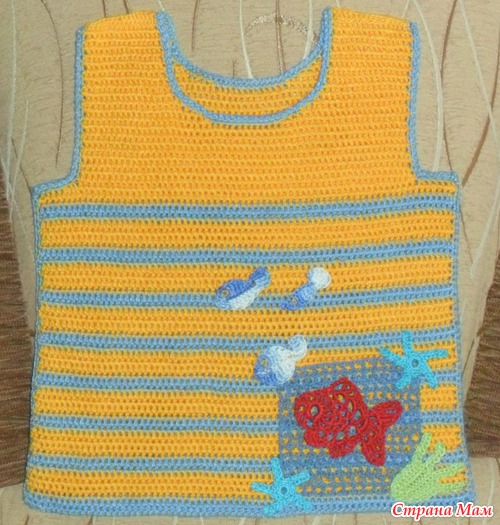 Вот такая маечка связалась для моего Женечки в ожидании отпуска. Ниточки Нарцисс (остатки), крючок 1,9. Одна беда - что-то он ее не хочет ее мерять. Я даже расстроилась