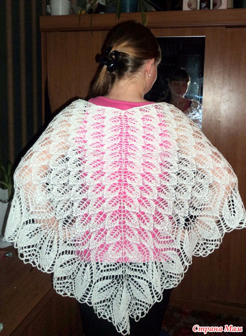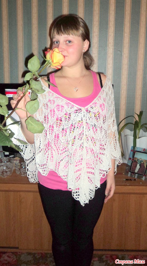 Связала я себе подарок ко дню рожденья - ажурную накидочку. Вообще-то, вязала по описанию шали, но пришила уже к готовому изделию пару пуговичек, и получилась довольно симпатичная, на мой взгляд, накидочка. Попросила дочь попозировать в ней для фото. Она, в свою очередь, попросила одеть её завтра в школу. Сдается мне, теперь я накидочку не поношу...