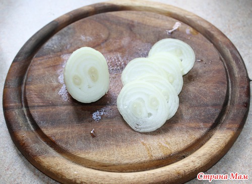 Лук тоже режем кольцами и ошпариваем кипятком, чтобы убрать лишнюю горечь