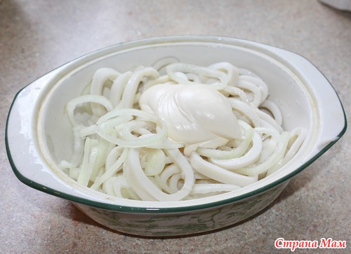 На четыре штуки кальмаров половина луковицы. Когда лука много, на мой вкус это не очень.