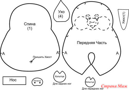 9) Сшить вместе 3 детали - основание, переднюю и заднюю части туловища, совмещая в точках А.