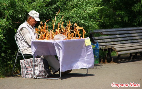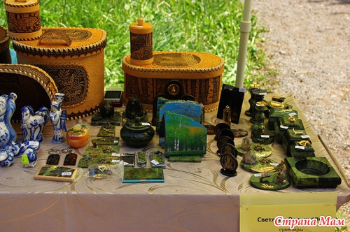 А этот дядечка продаёт изделия из натуральных камней, которые делает сам