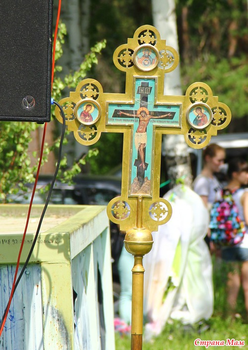 У сцены тоже иконы и крест