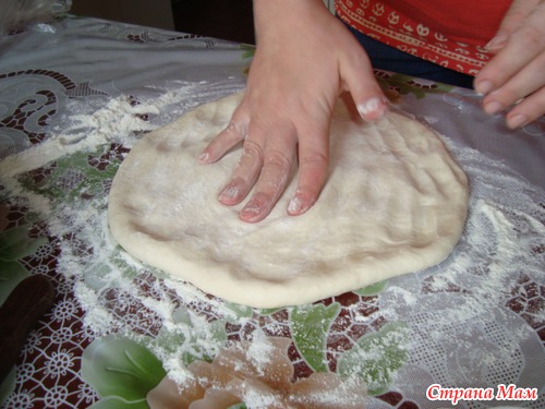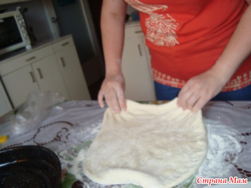 Тесто она уже сделала.. Мука вода, соль. чуть чуть масло подсолнечного и сразу в холодильник. в пакетике. Я пришла и за дело. мнем тесто тонко- тонко. Форму помазала тонким слоем масла.