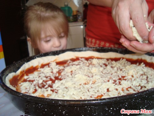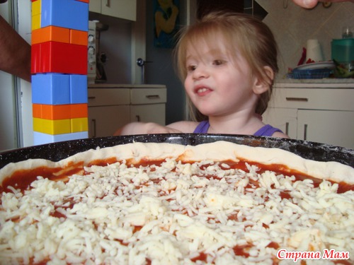 Тут маленькой азарнице не терпится, прям таки лезит в пиццу) Так и хочеться ее вместо мацареллы посыпать))
