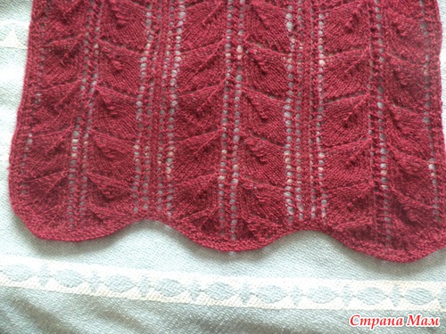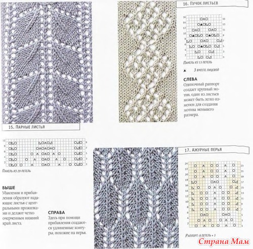Узор – листья из своей любимой книжки «Волшебный клубок. 700 схем и образцов вязания». Сканера для книги такой толстенной у меня сейчас нет, поэтому, да простит меня автор картинки, которую я утащила из интернета. Вот схема узора, который я вязала (левый крайний)