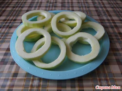 Итак, рецепт: 1 кабачок ( около килограмма), 2 стакана сахара, 2 литра воды, 0,5 ч. л. уксусной эссенции, гвоздики - 3 шт. Из этого количества получилось три литровых банки компота. Кабачок почистить от кожуры, порезать на кольца, ложкой выбрать мякоть.