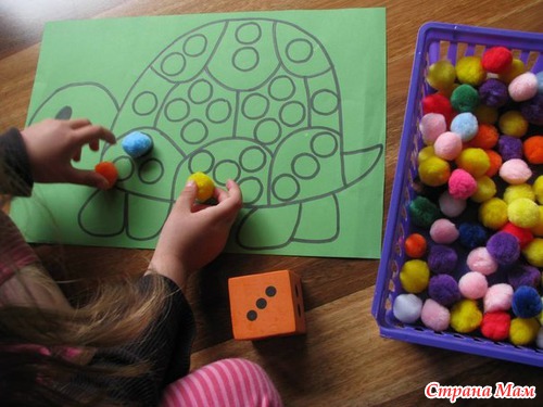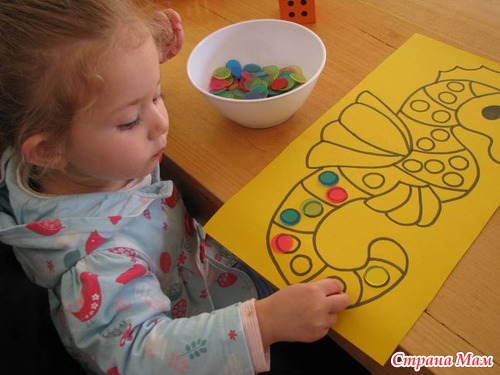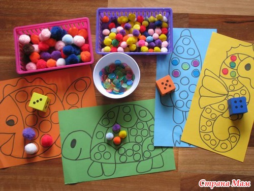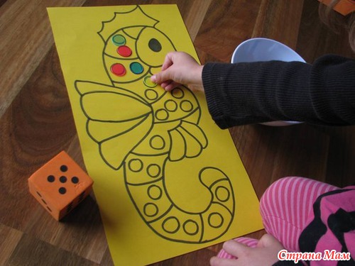 Крупные рисунки, которые вы видите на этих фото, нетрудно нарисовать самостоятельно на листах бумаги (разрежьте рулоны обоев, ватман или используйте листы формата А3 и А4). Кружочки внутри рисунков обведите по размеру того, что у вас есть в наличии - прозрачных пластиковых дисков для изучения цветов, ватных помпонов, крышек от пластиковых бутылок и т. п. Играть с такими развивающими рисунками можно по-разному: класть крышки или диски в круги так, чтобы они точно вписывались в контур, это тренирует координацию тонких движений пальчиков, можно подбросить игральную кость (кубик с точками) и заложить то количество кругов, которое выпадет на кубике, это тренирует математическое мышление. Можно решать задачки: закрыть пять кругов красными крышками и три круга синими, и сделать это на время - кто быстрее, например.
