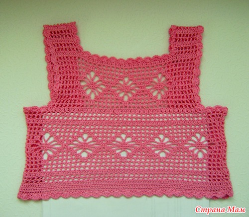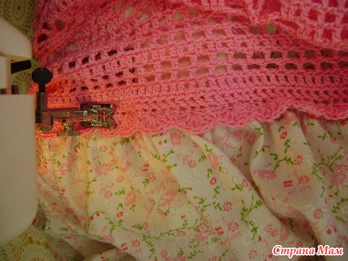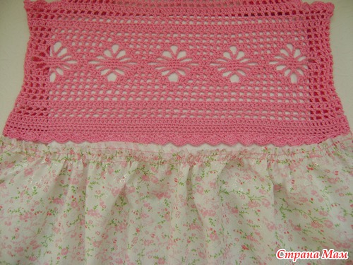 Платье из двух частей, где верх связан крючком, а низ пришит из тонкой воздушной ткани.
