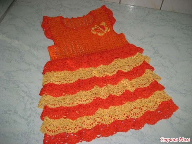Из остатков пряжи ириса и ЯрнАрта Виолет связалось мое оранжевое платьице для девочки 1,5 лет,