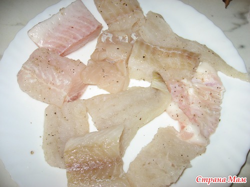 филе порезать на порционные кусочки, посолить, поперчить, сбрызнуть лимонным соком и отставить в сторонку..