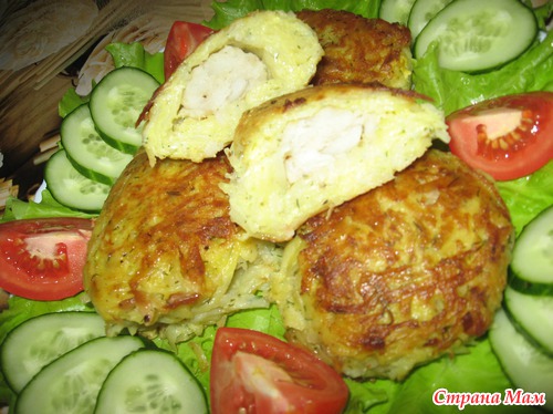 затем взять картошку, кусочек рыбы и сформировать в форме котлетки (рыбка внутри), слегка прижимая картофель..