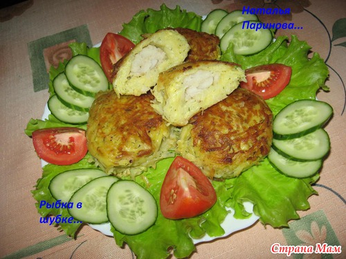 затем взять картошку, кусочек рыбы и сформировать в форме котлетки (рыбка внутри), слегка прижимая картофель..