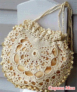 1ряд:5воз.петель,(пропустить 2 столбика с накидом,1столбик с накидом в следующую петлю)дважды,5воз.петли,1столбик с накидом в промежуток между следующей группой из 4столбиков с накидом,5воз.петель,пропустить 2 столбика с накидом,1столбик с накидом в следующую петлю,5воз.петли(1 столбик с накидом в следующий столбик без накида и в каждый 3-ий столбик без накида вокруг открытия сумки)закончить 5ю воз.петлями,1 столбик с накидом в последний промежуток,5воз.петель,пропустить 2столбика с накидом, 1 столбик с накидом между последних 2х столбиков с накидом,3воз.петли,полустолбик без накида в 3ю воз.петлю начальной цепочки(42петли).