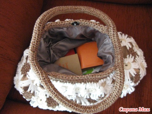 Сумку вязала из остатков, когда её увидела, прям захотела, спать не могла, связала быстро, но вот с подкладом намучилась, почти месяц мастерила. Какой подклад по журналу мне не понравился, и я сама уже мудрила с подкладом.