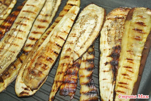 Баклажаны режем вдоль и жарим на сковороде-гриль с небольшим количеством растительного масла. Жарить на несильном огне.