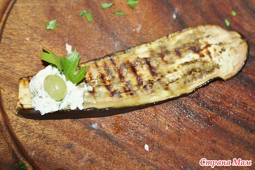 На ломтик баклажана выкладываем половинку столовой ложки сырной начинки, виноградинку и по желанию листик петрушки для красоты.
