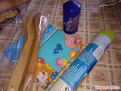 Вот такие вот нужности: полотенчико, лопатки деревянные, коврик, и задекупаженная свечка