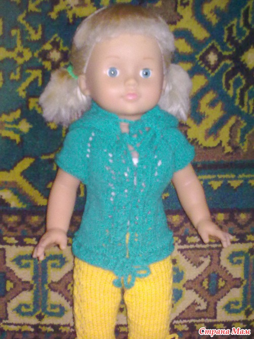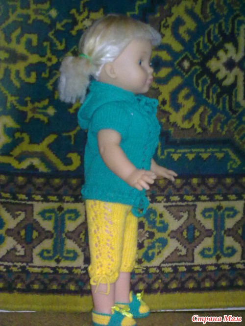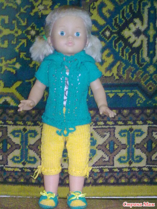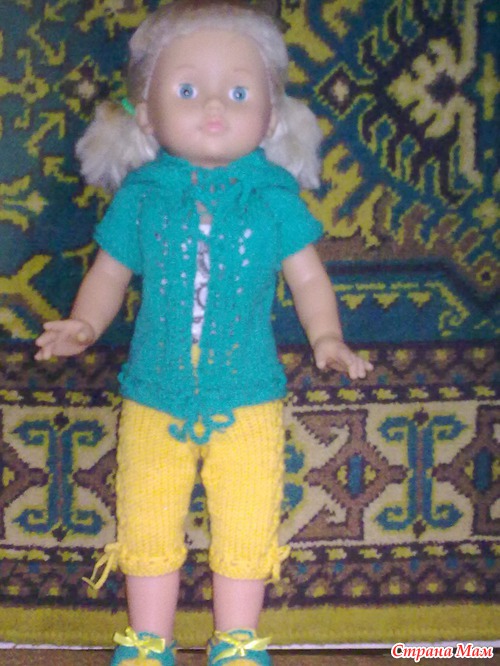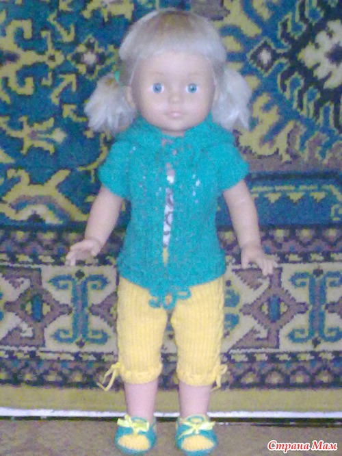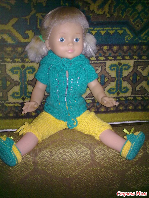 Ну вот стерла я жуткие ногти. Связала ей комплект и башмачки в придачу. А то в старой одежде она даже сидеть не могла. Брюки по швам расползались.
